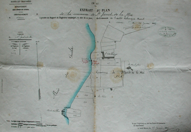 Extrait de plan : brèche à réparer, escalier à construire et enrochements au niveau du mur d'enceinte de l'Abbaye et de la digue, section A 55, 55 bis, 1885 (AD 22)Immatriculation