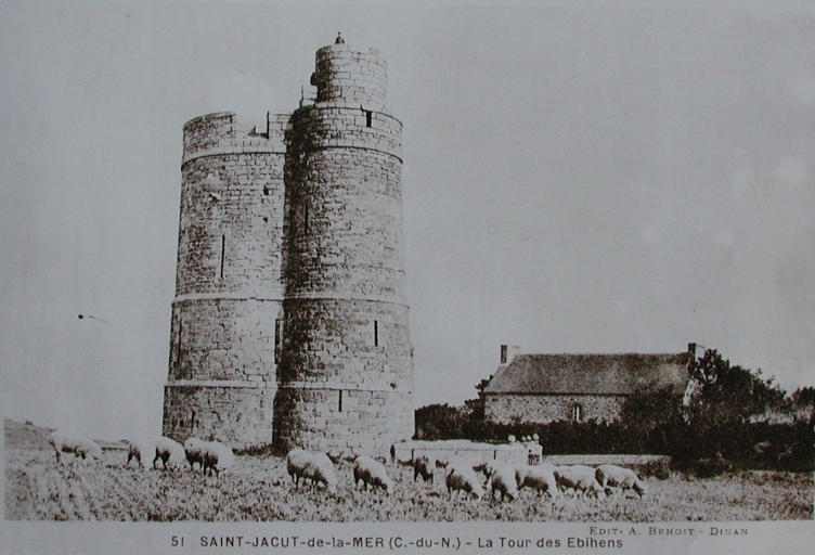 Vue de l'ancienne tour défensive au début du 20ème siècle et de l'habitat résidentiel proche de la tour (collection particulière, Amis du Vieux St-Jacut))Immatriculation