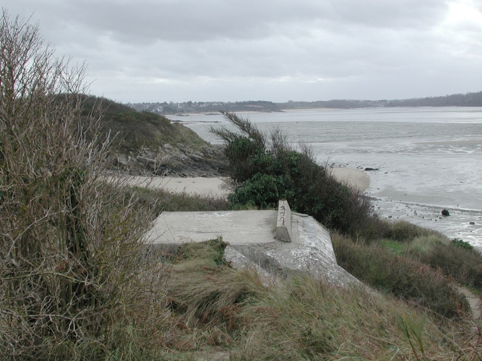 Vue de profil de l'ancien blockhaus du Chef de l'Isle, faisant face à l'Arguenon : remarquer le dôme frontal et le toit terrasseImmatriculation
