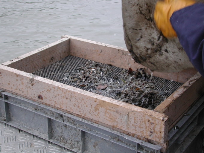 Les petites civelles sont versées dans une caisse pour y être triées selon la taille règlementaireImmatriculation