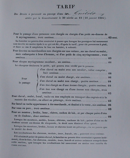 Affiche : droits à percevoir pour le passage du Guildo en 1804 (collection particulière)Immatriculation