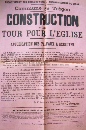 Annonce par voie d'affichage public de l'adjudication des travaux à entreprendre pour la construction de la nouvelle tour de l'église paroissiale Saint-Petrock, 1887 (AD 22)Immatriculation