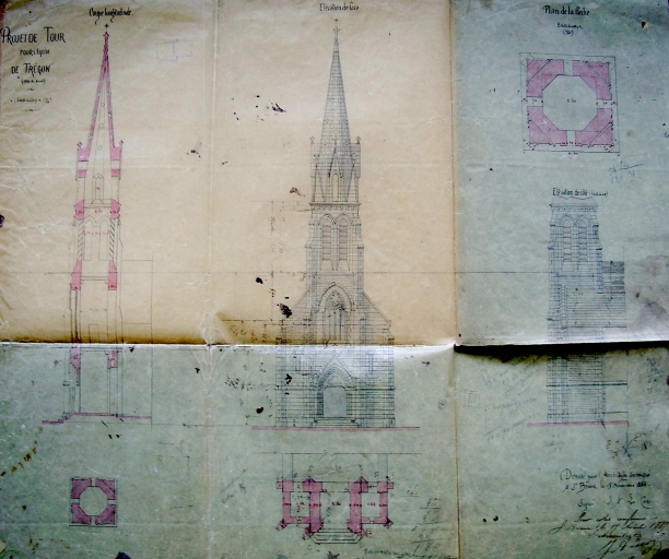Projet de construction de la nouvelle tour de l'église paroissiale Saint-Petrock, coupe longitudinale, élévation de face, élévation latérale et plan de la flèche, par l'architecte briochin J.-A. Le Coz, le 15 novembre 1884 (AD 22)Immatriculation