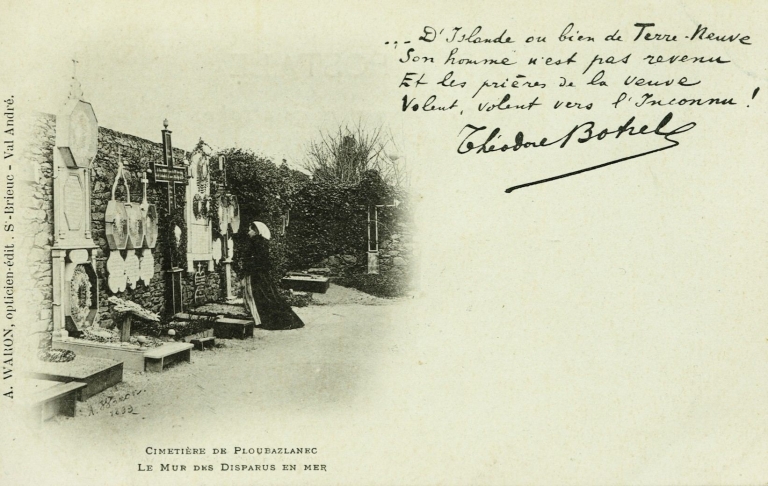 Le mur des 'Disparus', vers 1903, avec une dédicace de Charles Botrel, qui fit connaître les drames de mer de la grande pêche (Carte postale, AD 22 16 Fi)Immatriculation