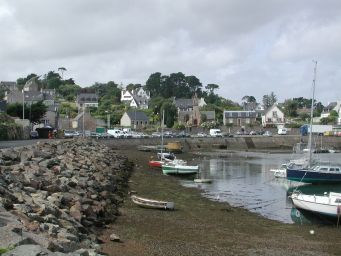 Vue de la partie Sud du front de port Sud : remarquer les enrochements et les murs de quais devant le parking du port de Loguivy, le bâti public et religieuxImmatriculation