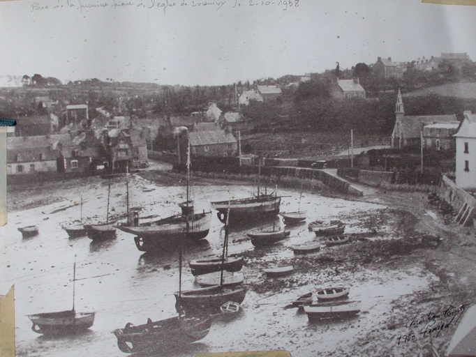 Vue de la partie Sud du port après 1939 : échouage des sloops de pêche en amont du port : remarquer le mur de souènement et la rampe d'accès à la grève Ouest (collection particulière)Immatriculation