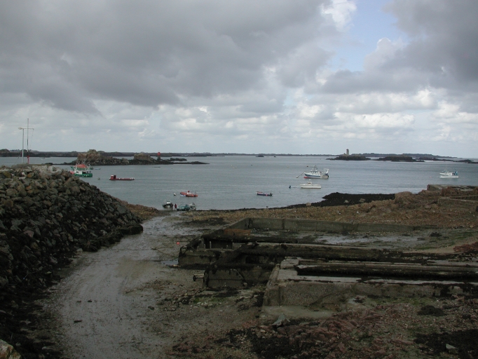 Vue du chemin bétonné qui conduit aux viviers en ciment en contre-bas des enrochements à l'est du portImmatriculation
