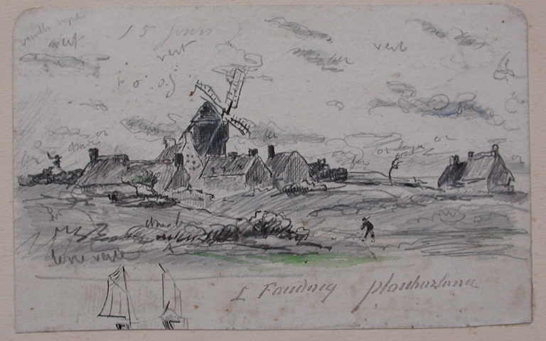 Reproduction d'un dessin de Louis Marie Faudacq, représentant un moulin à vent dans un hameau de Ploubazlanec, fin 19ème siècle (collection particulière)Immatriculation