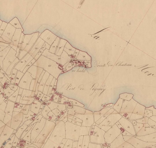 Extrait du cadastre de 1832 , section E1 : le front de mer de Loguivy-de-la-Mer, avec l'habitat groupé autour du port (AD 22)Immatriculation