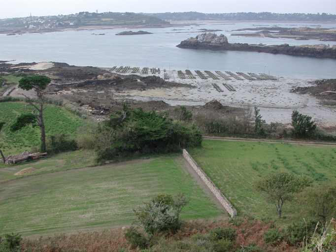 Vue de la 'plage aux Courlis' : remarquer les parcs à huîtres sur l'estran et les vestiges des pêcheriesImmatriculation