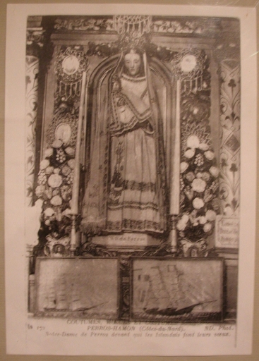 Vue des deux ex-votos qui encadrent la statuette de la chapelle de Perros-Hamon, début 20ème siècle (carte postale, collection particulière)Immatriculation
