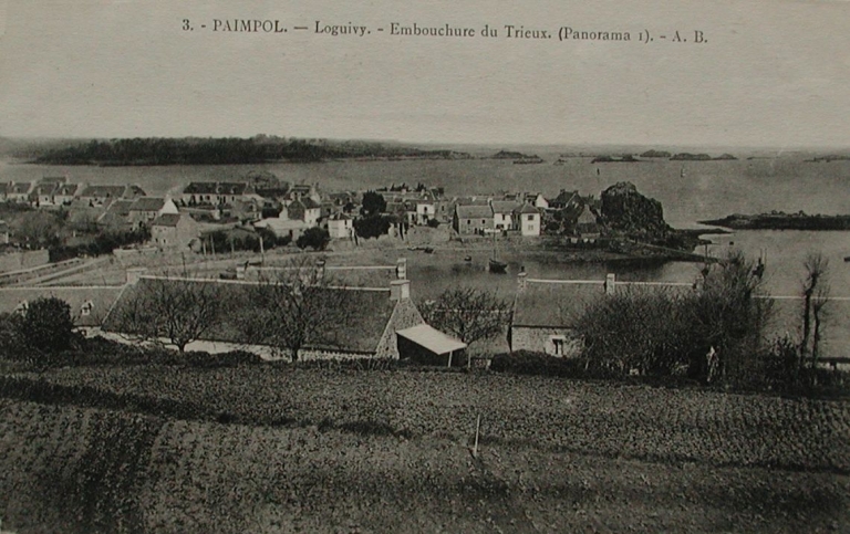 Vue d'ensemble du front de port de Loguivy depuis les champs cultivés derrière le hameau du Tourot, début 20ème siècle (carte postale, collection particulière)Immatriculation
