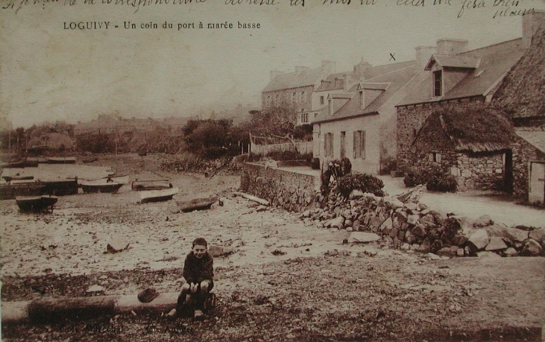 Vue de l'entrée Sud du port, vers le hameau du Torot, début 20ème siècle : remarquer les limites de la grèves jusqu'au mur des premières habitations (carte postale, collection particulière)Immatriculation