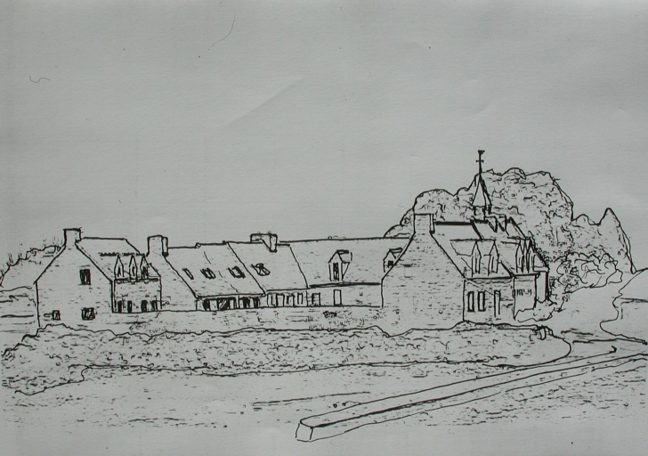 Vue générale : dessin des bâtiments associés à la chapelle de Saint-Riom, septembre 2008 (Hervé De Roeck, collection particulière)Immatriculation