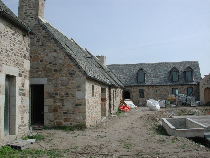 Vue des bâtiments Ouest et Nord en travaux : remarquer la couverture en ardoises de schiste de Sizun et les toits à longs pansImmatriculation