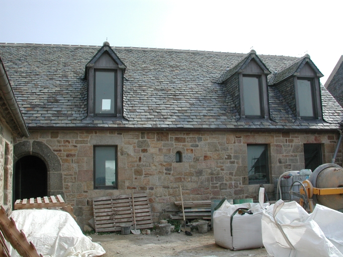Vue du bâtiment qui jouxte la chapelle : remarquer les ouvertures en plein cintre et les linteaux droitsImmatriculation