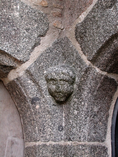 Vue de détail de la tête de moine sculptée sur le pilier en granite commun aux deux ouverturesImmatriculation