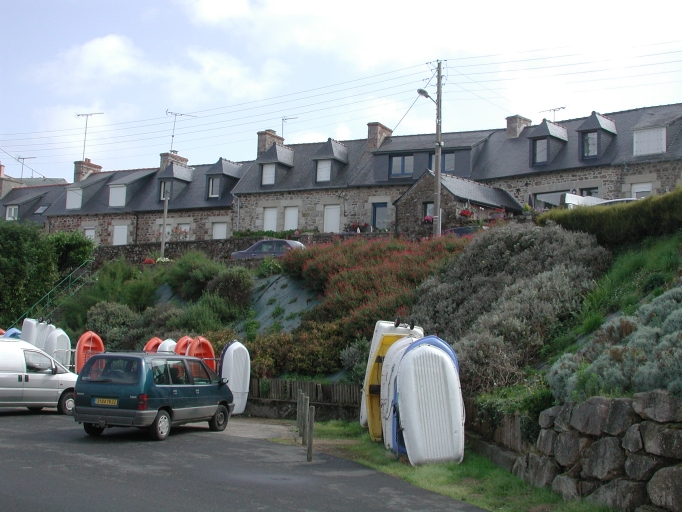 Le front de port Est de Loguivy avec son groupe de maisons traditionnelles, alignées, rangées et en hauteur, au-dessus du portImmatriculation