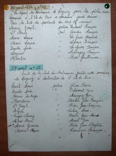 Enquête de la classe de CM1-CM2 de l'école publique de Loguivy-de-la-Mer, 1992 : liste des équipages en partance pour l'Ile de Sein le 20 avril et le 4 mai 1884 (Musée 'Mémoire d'Islande)Immatriculation