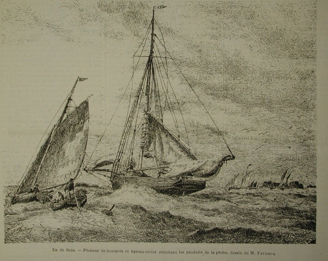 Dessin, gravure de Louis-Marie Faudacq : homardiers de Loguivy à l'Ile de Sein, publié dans le 'Yacht', 1886 (collection particulière)Immatriculation