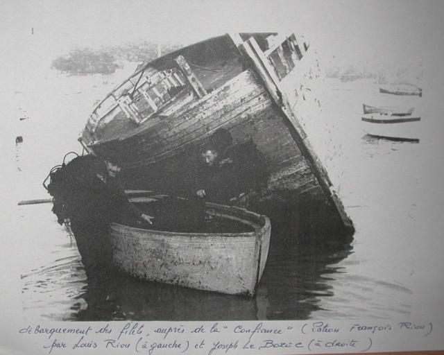 Débarquement des filets (Louis Riou et Joseph Le Bozec) à côté de l'épave de la 'Confiance' de François Riou, vers 1950 (collection particulière)Immatriculation