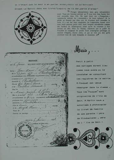Enquête de la classe de CM1-CM2 de l'école publique de Loguivy-de-la-Mer, 1992 : Les naissances et les mariages entre Loguiviens et Seinans (livret, 'De Loguivy-de-la-Mer à l'Île de Sein', p. 3, collection particulière)Immatriculation