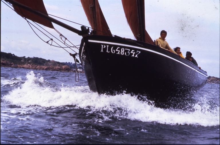 Vue de 'An Durhunel' en régates, au portant, pendant les fêtes de Ploumanac'h, avec Louis Le bellec à la barre : remarquer comme le bateau soulage de l'avantImmatriculation