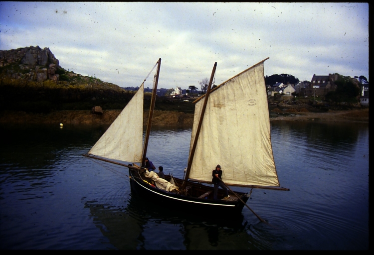 Vue de 'An Durzhunel' au départ du port de Loguivy, à la godille, 1984, avec Christophe Kerneau, premier chef de bordImmatriculation