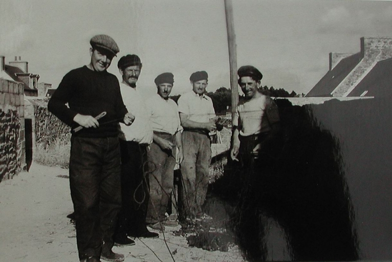 Marins loguiviens, dont Louis Riou et Yves Le Guen, en train de réparer des filets, 2ème quart 20ème siècle (collection particulière)Immatriculation