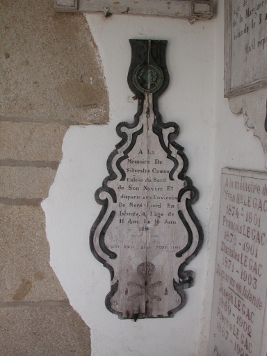 Vue d'un 'Mémoire' en marbre bois en souvenir de Sylvestre Camus, disparu en mer d'Islande en 1856 à l'age de 16 ans (sous le porche)Immatriculation