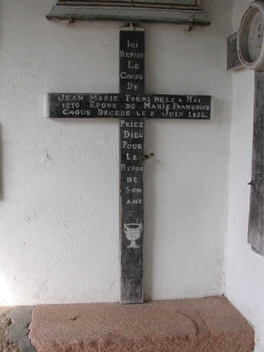 Vue d'un 'Mémoire', sous la forme d'une croix en bois, haute de 115 cm : en souvenir de J.M. Poëns, époux de M.F. Caous, décèdé en mer le 2 juin 1854 (sous le porrche)Immatriculation
