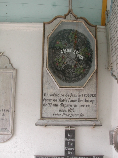 Vue d'un 'Mémoire', sous la forme d'un cadre en bois, décoré de perles (154 cm x 65 cm) : en mémoire de Jean Le Troquer, 1899 (sous le porche)Immatriculation