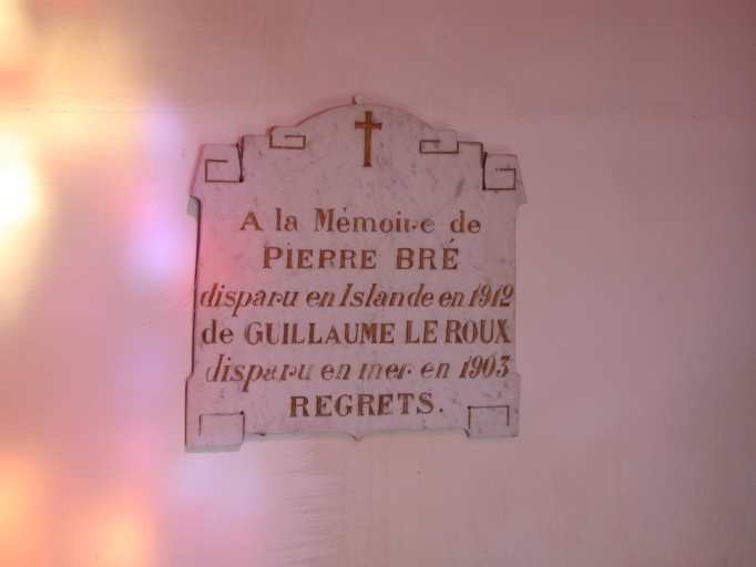 Vue d'un ex-voto (plaque de marbre) en mémoire des naufragés de 1903 et de 1912Immatriculation