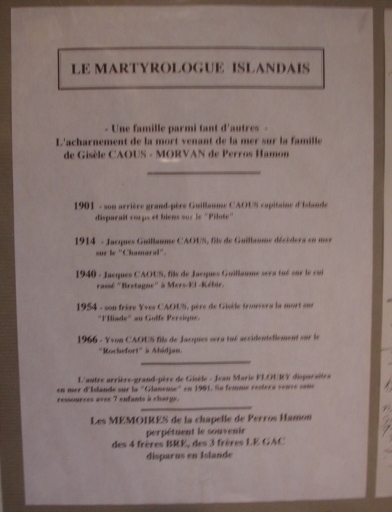 Le 'martyrologie' des Islandais, en particulier la famille Le Gac, Bré, Caous et Morvan de Ploubazlanec, dont les 'Mémoire' ornent la chapelle de Perros-Hamon (collection Plareneg Gwechall)Immatriculation