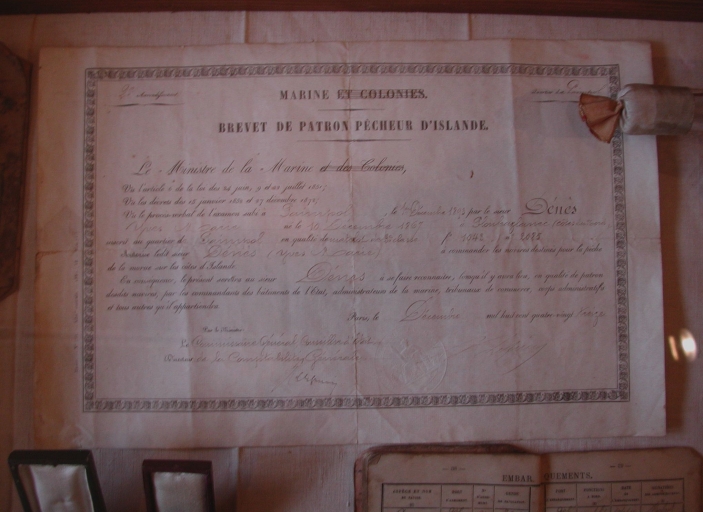 Brevet de patron pêcheur à Islande du capitaine Yves-Marie Dénes, 1893Immatriculation