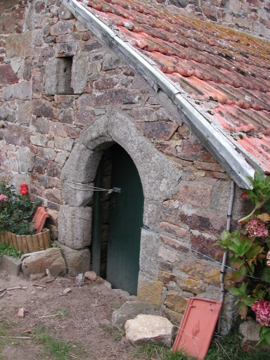 Vue de l'appentis Est, construit en moellons de granite, de schiste et de grès : remarquer la porte en plein cintre et la couverture en tuilesImmatriculation