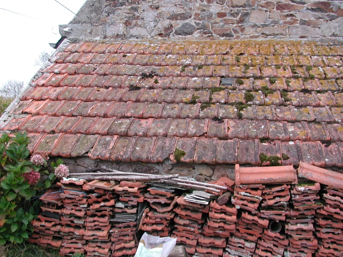 Vue de la couverture en tuiles de l'appentis Est, avec les tuiles qui couvraient l'ensemble de l'habitationImmatriculation