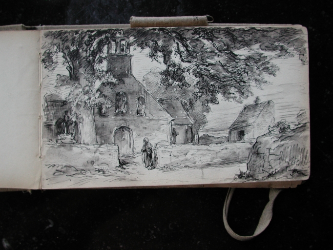 Extrait d'un carnet de dessins de Boulard, Fils : vue de la chapelle de Perros-Hamon et du porche ;Immatriculation