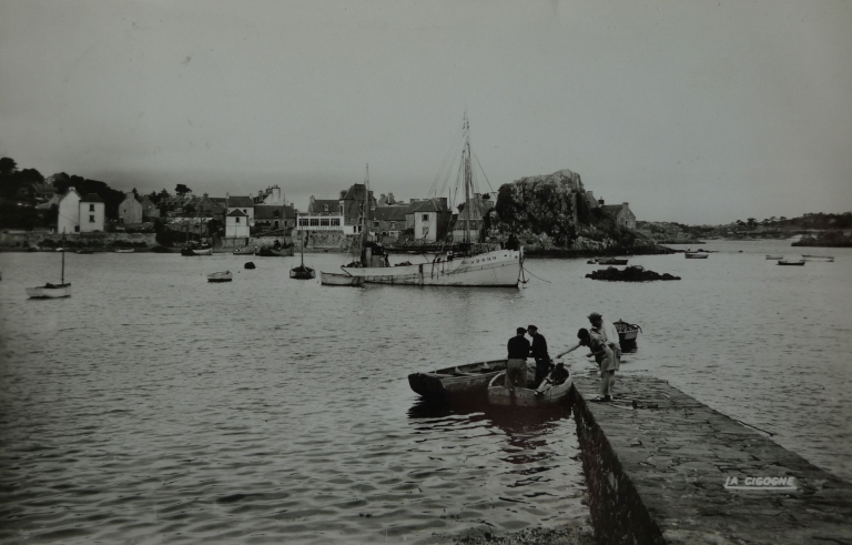 Vue de l'un des derniers langoustiers à voile et à maoteur quittant le port de Loguivy vers 1960 (carte postale, collection particulière)Immatriculation