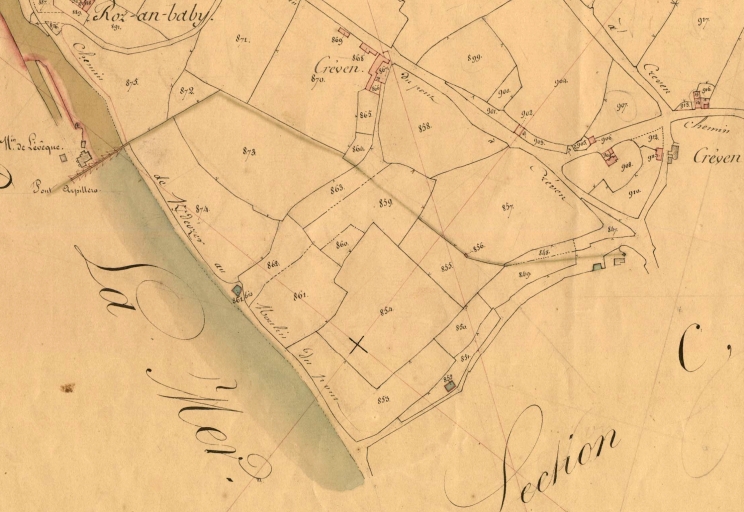 Extrait du cadastre ancien de Plouguiel : on distingue nettement le circuit d'adduction d'eau depuis la fontaine de Créven jusqu'au pont aqueduc sur le GuindyImmatriculation