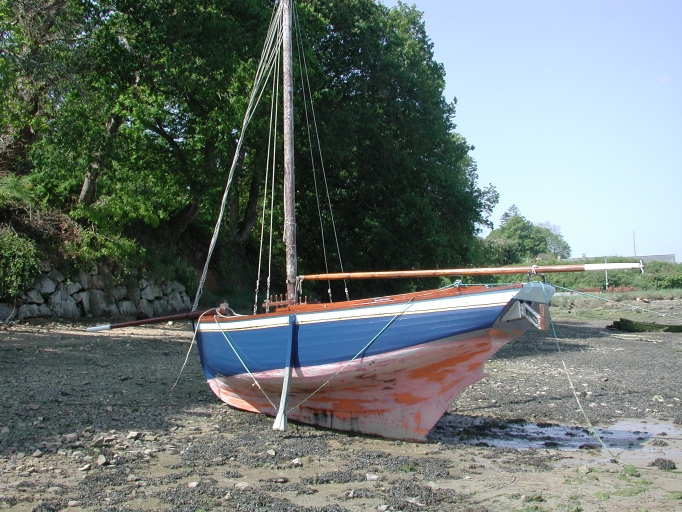 Vue d'un sloop de plaisance 'Scravic', demi ponté, long de 4 m, avec un grément aurique, à Beg MélenImmatriculation