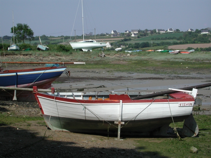 Vue des bateaux à l'échouage près de l'ancien chantier naval Yvon Clochet à Beg Mélen, dont 'Fitous'Immatriculation