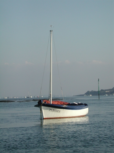 Vue du canot creux misainier 'Bugel' de l'ancien charpentier de marine Yvon Clochet, construit par ses soins, à flot à Beg MélenImmatriculation