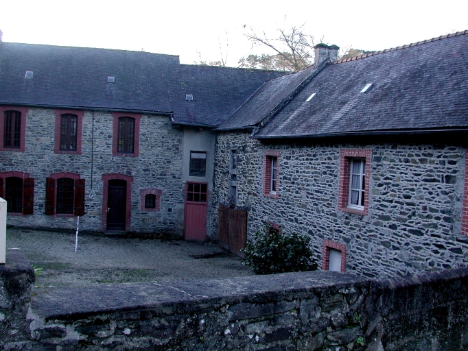 Minihy-Tréguier, le Guindy : le Moulin du Pont, vue générale de la cour, photographie de 2008. Remarquer l'encadrement des ouvertures en brique et la maçonnerie en moellon de schisteImmatriculation