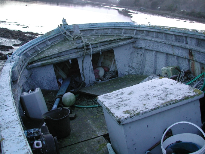 Vue de l'aménagement intérieur et de la charpente de 'Taupie 2' : remarquer les membrures franches en orme et le bordage en sapinImmatriculation