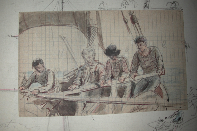 Dessin aquarellé sur papier quadrillé de Louis Marie Faudacq : équipage aux 'karennous' ou aux avirons, fin 19ème siècle (collection particulière)Immatriculation