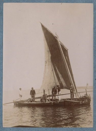 Photographie de Louis Marie Faudacq : bateau sablier de la rivière de Tréguier, fin 19ème siècle : remarquer l'apiquage de la voile, l'équipage nombreux à bord (tirage d'après plaque de verre, collection particulière)Immatriculation