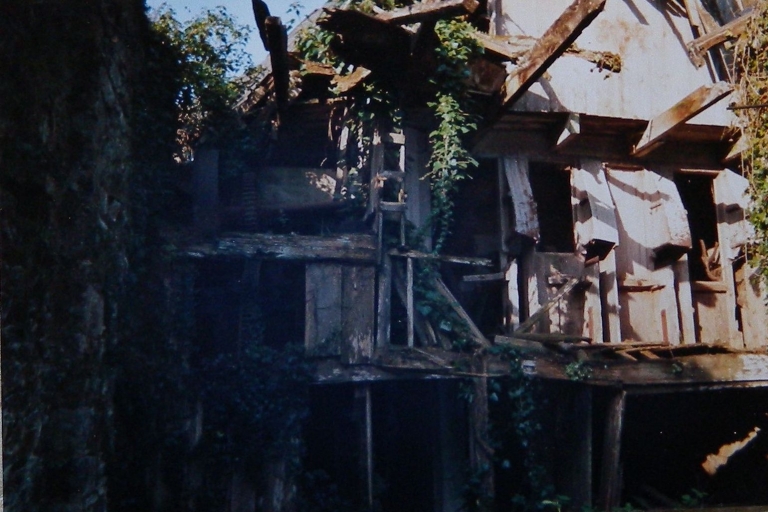Etat du moulin de Kerousy avant sa restauration vers 1985, façade Sud : vue des spatules et de 'l'ours' (collection particulière)Immatriculation