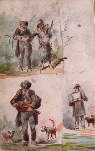 Dessin de Louis- Marie Faudacq, peintre douanier : vendeurs de feuilles volantes comme Yann ar Gwen ou Hyacinthe ar Vaou (collection particulière)Immatriculation