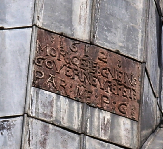 Chapelle primitive, vue détaillée de la flèche en zinc : inscription commémorativeImmatriculation